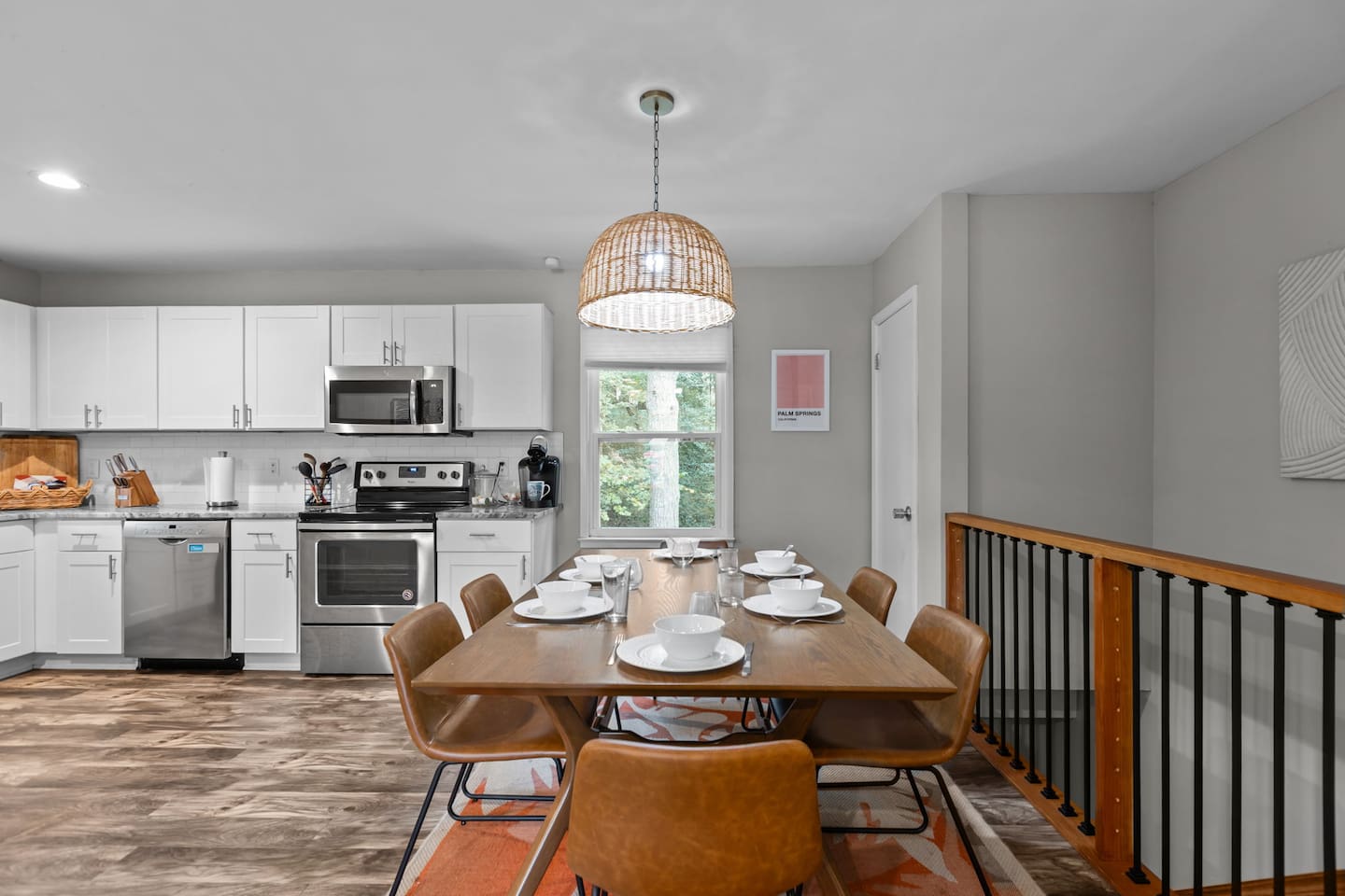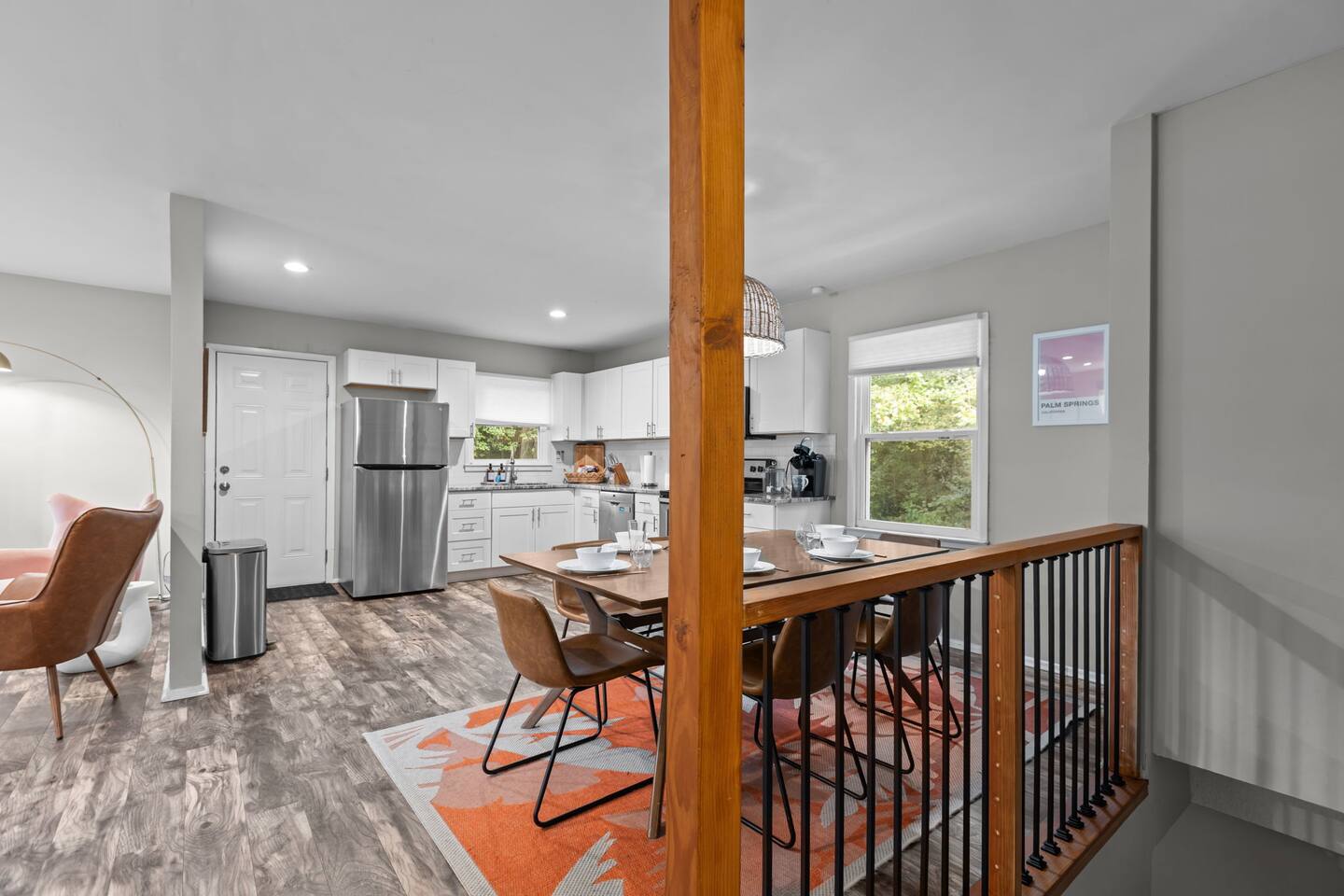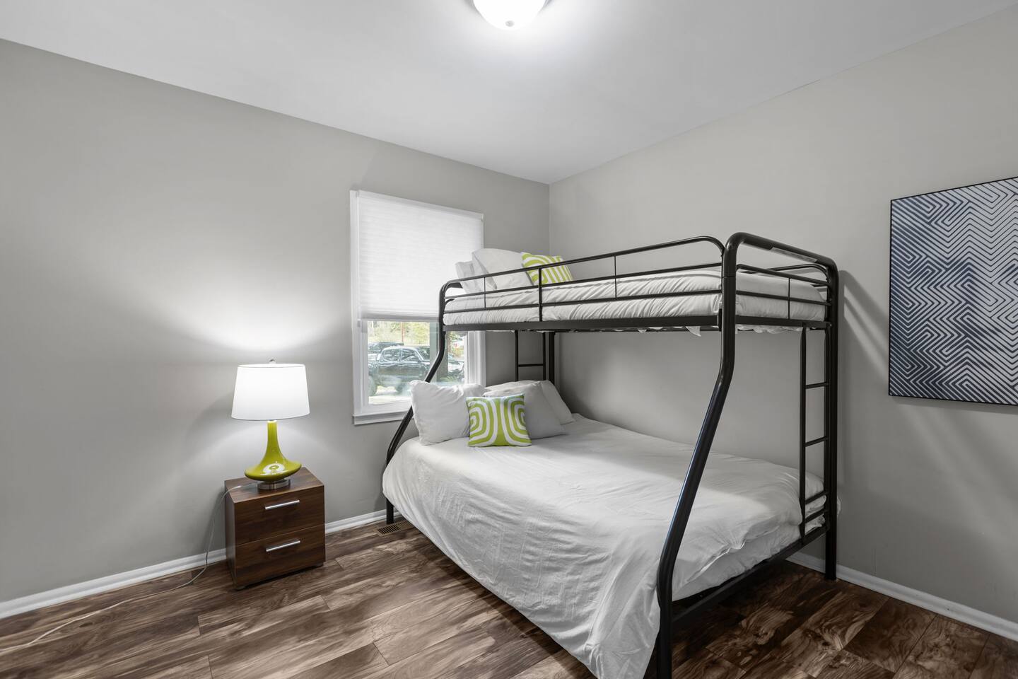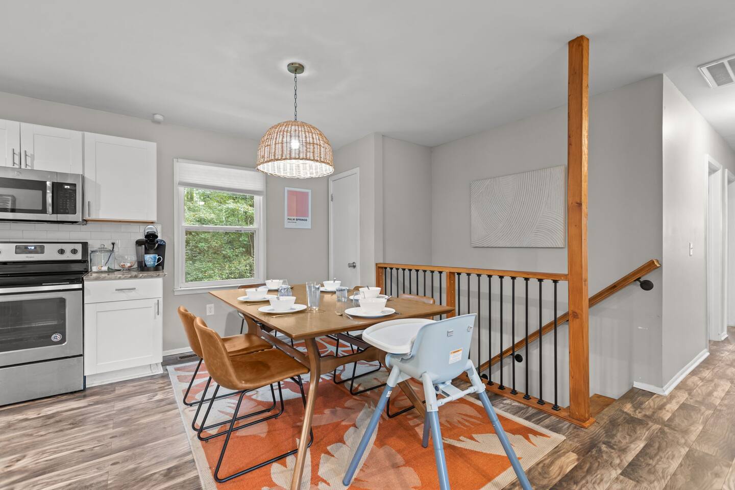 This expansive 5-bedroom retreat with 7 plush beds welcomes your group in comfort and style. Two distinct living spaces invite connection—an airy upstairs lounge with open kitchen, and a cozy downstairs haven with TV and pool table, perfect for cinematic evenings and lively game days. Ideally located minutes from North Carolina State University and the vibrant energy of Red Hat Amphitheater, and moments from Coastal Credit Union Music Park at Walnut Creek for unforgettable concerts.