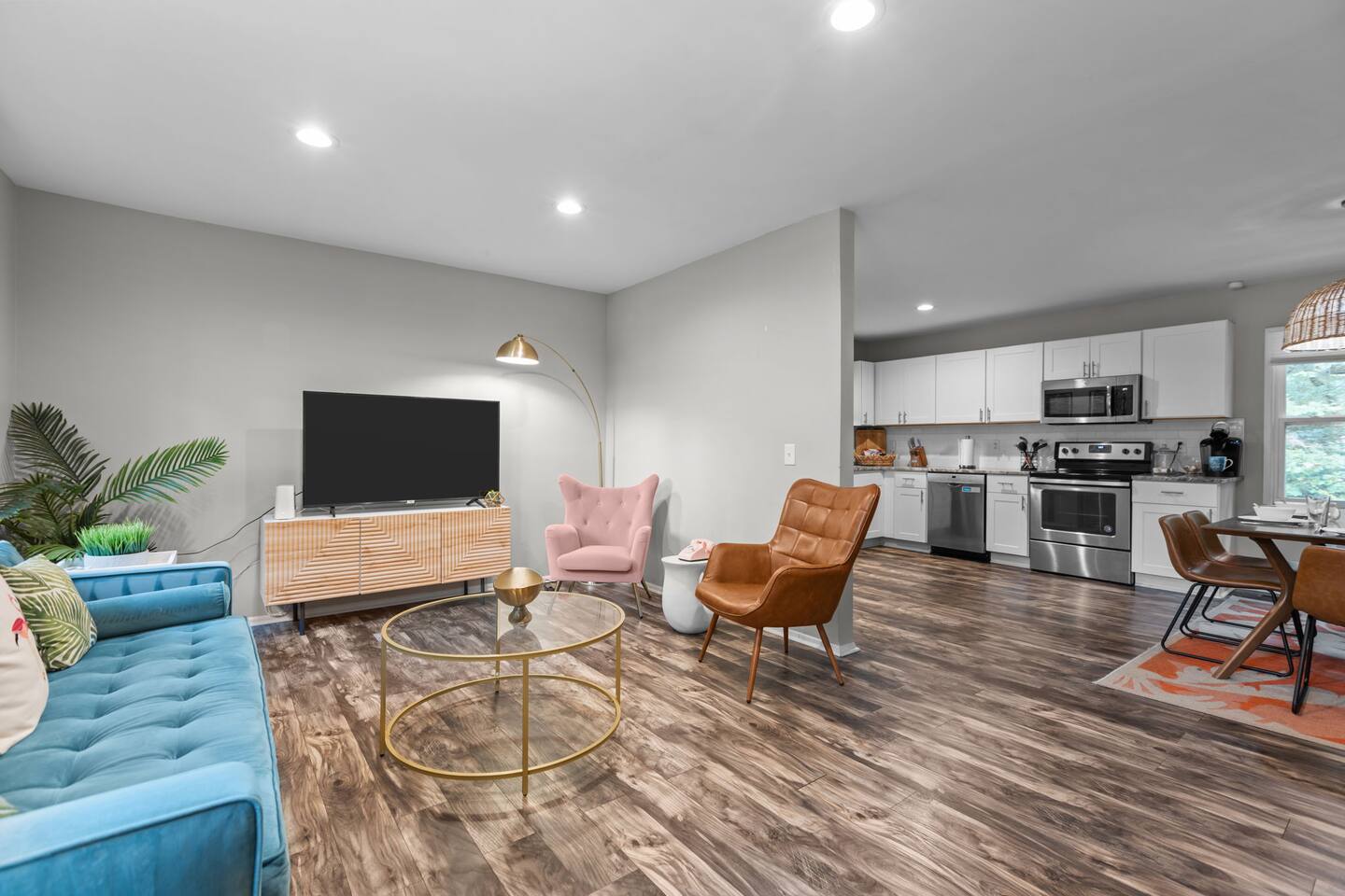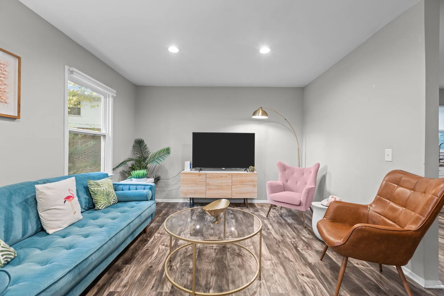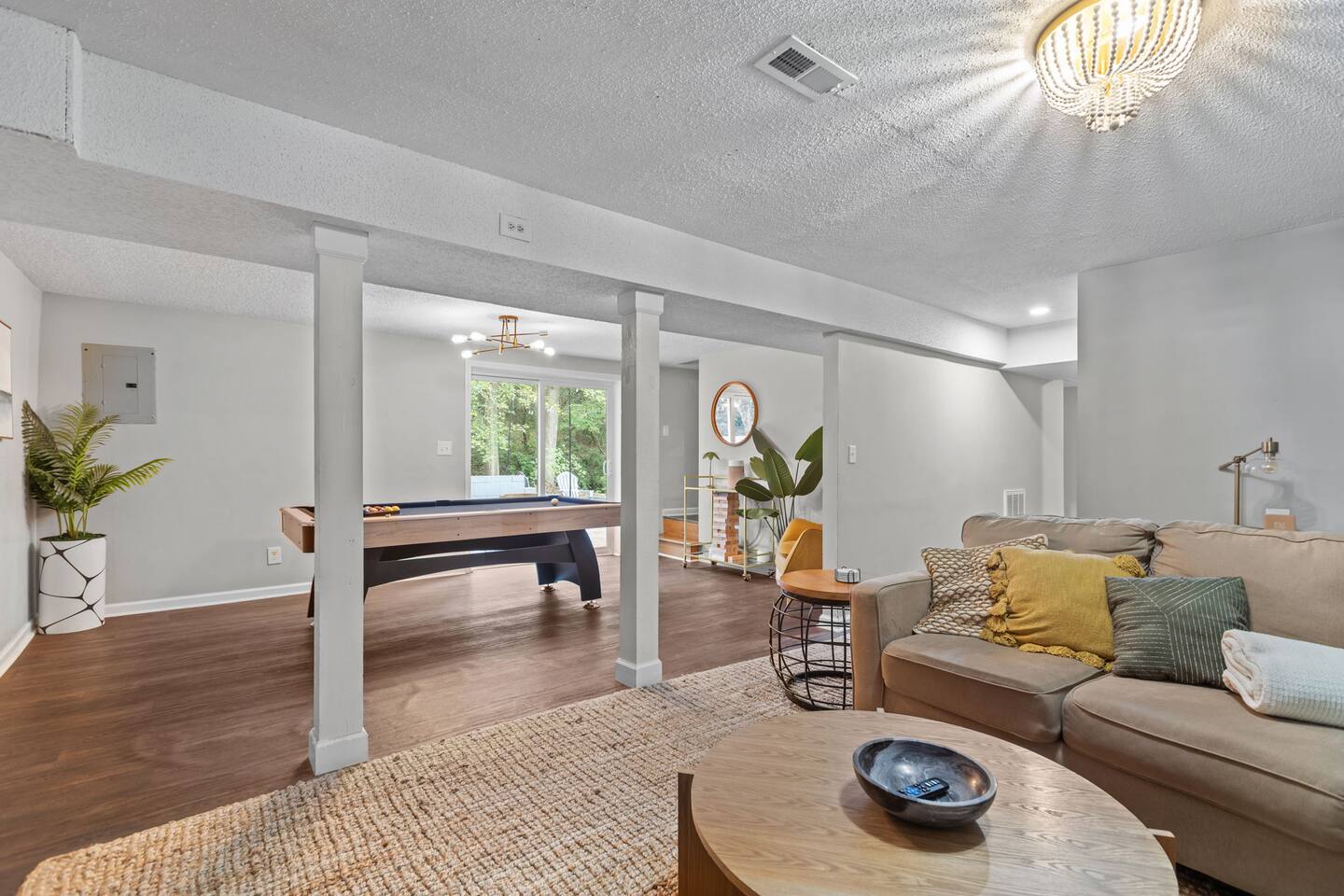 This expansive 5-bedroom retreat with 7 plush beds welcomes your group in comfort and style. Two distinct living spaces invite connection—an airy upstairs lounge with open kitchen, and a cozy downstairs haven with TV and pool table, perfect for cinematic evenings and lively game days. Ideally located minutes from North Carolina State University and the vibrant energy of Red Hat Amphitheater, and moments from Coastal Credit Union Music Park at Walnut Creek for unforgettable concerts.