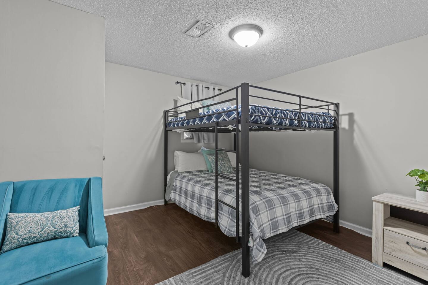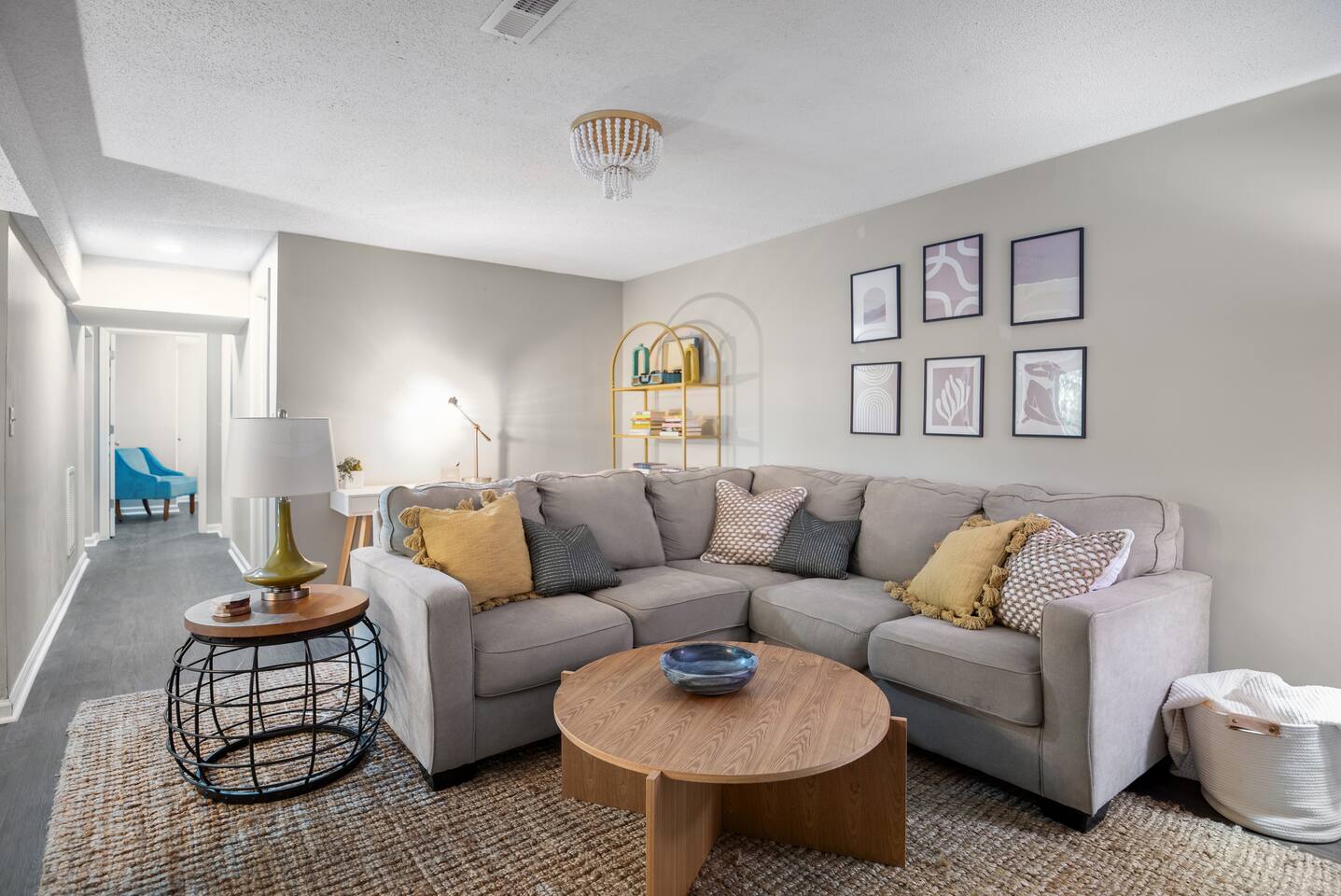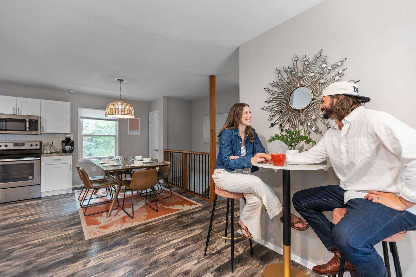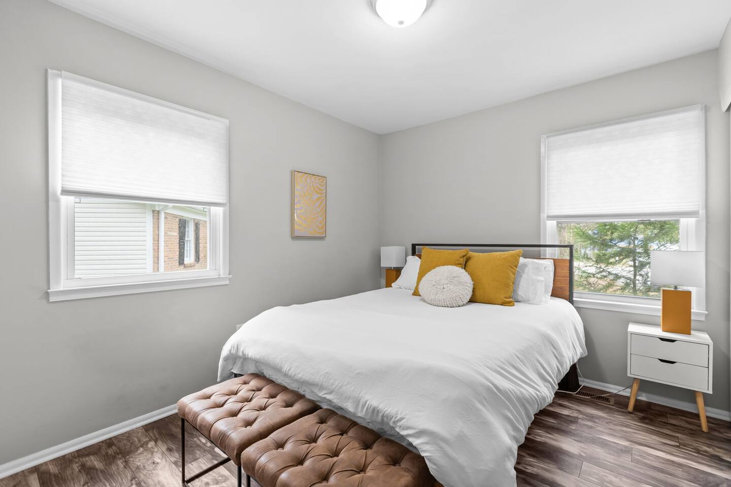 This expansive 5-bedroom retreat with 7 plush beds welcomes your group in comfort and style. Two distinct living spaces invite connection—an airy upstairs lounge with open kitchen, and a cozy downstairs haven with TV and pool table, perfect for cinematic evenings and lively game days. Ideally located minutes from North Carolina State University and the vibrant energy of Red Hat Amphitheater, and moments from Coastal Credit Union Music Park at Walnut Creek for unforgettable concerts.