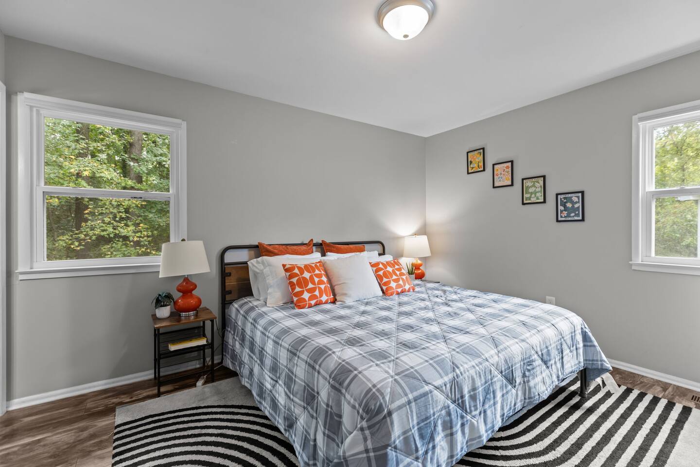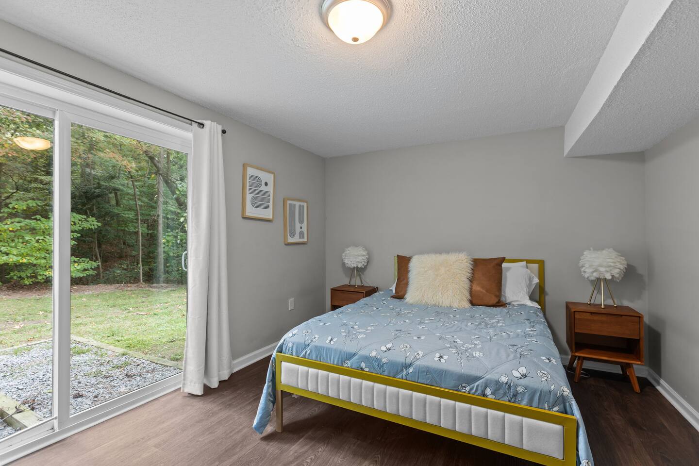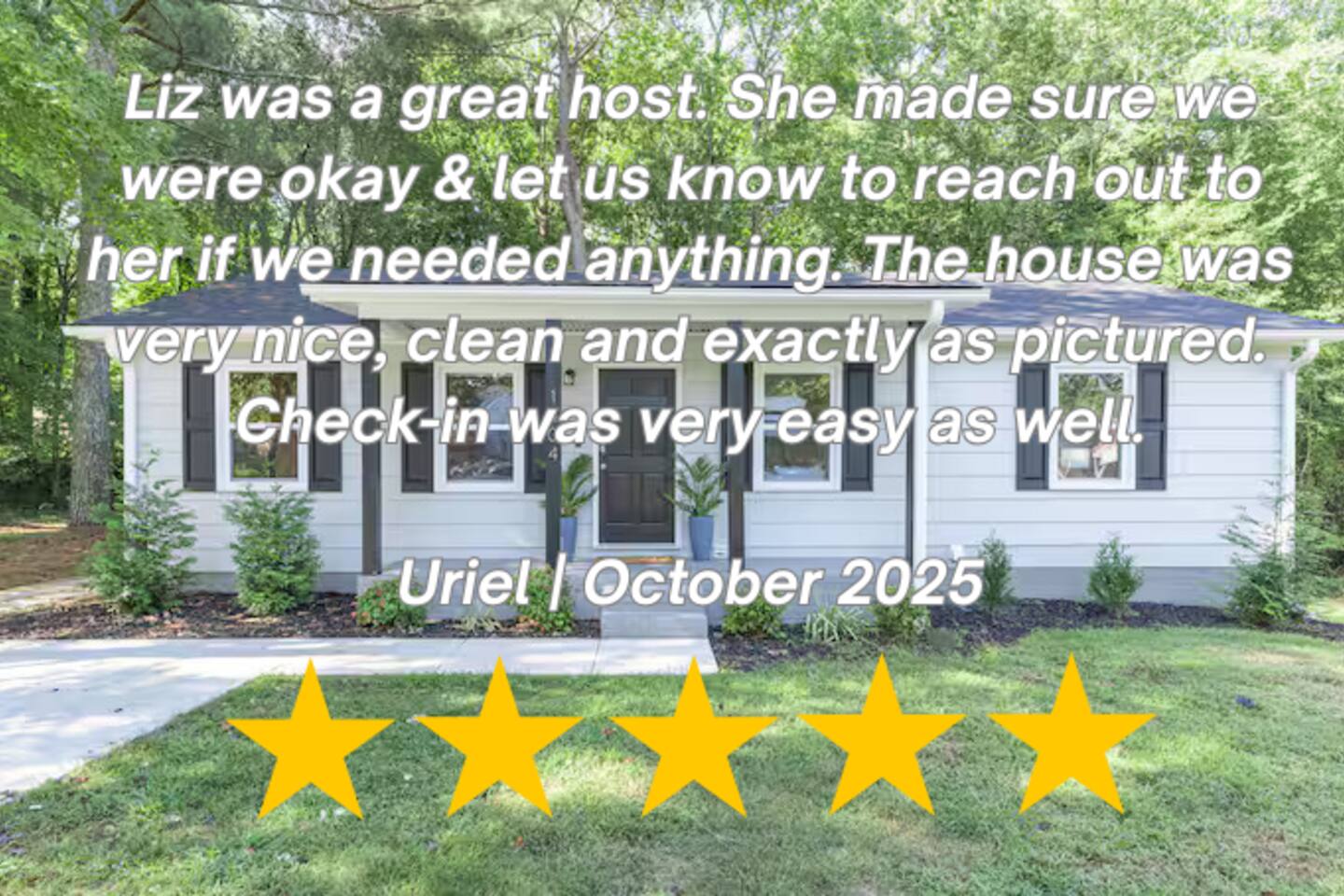* You will enjoy exclusive access to the entire 2,000-square-foot private retreat, offering expansive interiors and thoughtfully designed spaces perfect for relaxing, gathering, and creating unforgettable memories near Raleigh. * Unwind beneath the stars at the serene backyard fire pit, where towering trees and the gentle melody of a flowing creek create a peaceful, storybook setting. * The home features two spacious living lounges, a dedicated game room, 5 beautifully appointed bedrooms, 7 comfortable beds, 3 full bathrooms, a private patio, and a convenient in-home laundry area. * The primary suite is a tranquil sanctuary with its own elegant en-suite bathroom, offering privacy and comfort. * Curated amenities include luggage racks, a fully equipped modern kitchen, generous closet space, and premium toiletries for a seamless stay. * Tucked away at the end of a quiet cul-de-sac, the home offers exceptional privacy, calm surroundings, and a true escape from the everyday. * A long private driveway accommodates up to 3 vehicles, with additional easy parking available nearby. * Designed with comfort in mind, the home includes main-floor bedrooms and walk-in showers, offering ease and accessibility for all guests.