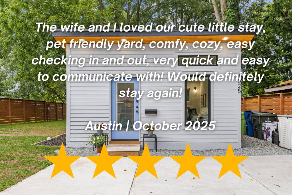 The guest house is a high-ceiling studio plus a full bathroom. Its features include: ☀ Queen size bed ☀ Modern kitchen with full-size refrigerator, oven, microwave, and dishwasher ☀ Two-person bar table ☀ Desk area for remote work ☀ G**gle Fiber Wi-Fi ☀ 55" LED Fire TV, swivel-mounted, complimentary Netflix, Prime, Hulu ☀ Large fenced-in yard with beautiful oak and pecan trees ☀ Patio table/umbrella with gas grill and Solo Stove fire pit ☀ Outdoor table/chairs ☀ Off-street parking for one car plus additional free parking on the street ☀ Washer and dryer