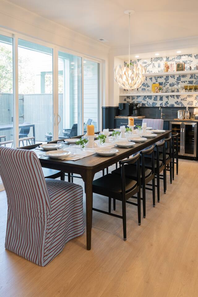 HOUSE HIGHLIGHTS: ☀️ Patio lounge with outdoor TV and Weber gas grill ☀️Two wet bars including wine fridges ☀️Sophisticated adult bunk bedroom with 4 queen-size beds ☀️Designer Kitchen with Thermidor appliances, double dishwashers, and a huge kitchen island! ☀️A breakfast/coffee room ☀️Terra Cafe machine for specialty coffee drinks ***Tour this house with a QR code found in the additional photos section*** FIRST FLOOR SLEEPING & BATHROOM ARRANGEMENTS: ☀️Bedroom 1: Queen bed and Roku TV ☀️Full bathroom 1: Bathroom with shower SECOND FLOOR SLEEPING & BATHROOM ARRANGEMENTS: ☀️Bedroom 2: Primary with king bed, Roku TV, and ensuite soaker tub & shower ☀️Bedroom 3: Queen bed and Roku TV ☀️Bedroom 4: Queen bed and RokuTV & vanity ☀️Bedroom 5: Queen bed and Roku TV ☀️Full bathroom 2: Primary bedroom ensuite bath ☀️Full bathroom 3: Hallway bathroom, 3-person design with privacy doors THIRD FLOOR SLEEPING & BATHROOM ARRANGEMENTS: ☀️ Bedroom 6: Kid's bunk room with 2 full-size beds ☀️ Bedroom 7: Adult bunk room with 4 queen-size beds in private quarters w/lights and charge ports ☀️Full bathroom 4: Hallway bathroom, 3-person design with privacy doors Like to golf? Guests can schedule an hour at a gold simulator lounge, .5mi from the house, on us!