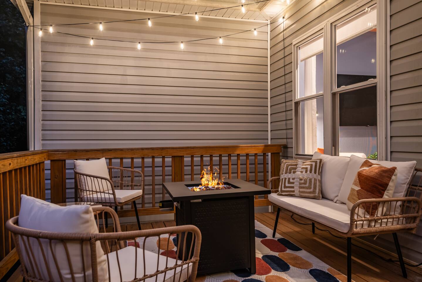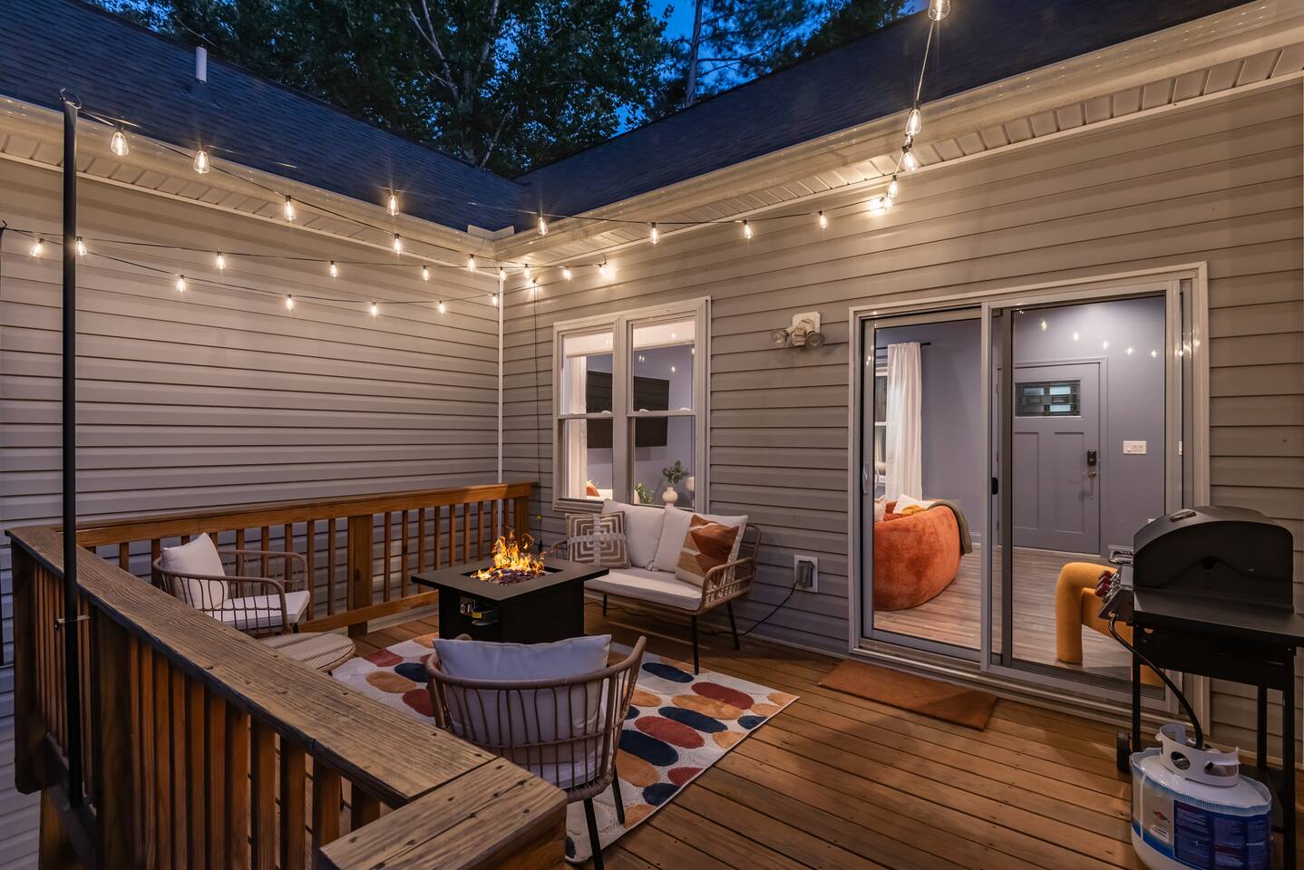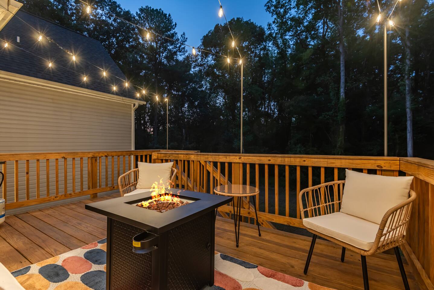 - There is a living room, 4 bedrooms, bonus area, a large stocked kitchen, dining area, 2.5 bathrooms, back deck, front porch and a laundry room for your use. - The master bedroom has a large en-suite full bathroom with both a shower and a separate bath tub. - Enjoy the fire pit on the back deck surrounded by beautiful trees and string lights - There are TVs in 3 of the 4 bedrooms - Amenities provided for your comfort include full kitchen supplies, ample closet space, and toiletries - Located on a quiet, private street with a large driveway - For guests that have accessibility concerns or mobility issues, there is a walk-in shower. There are a few steps required to access the front door.