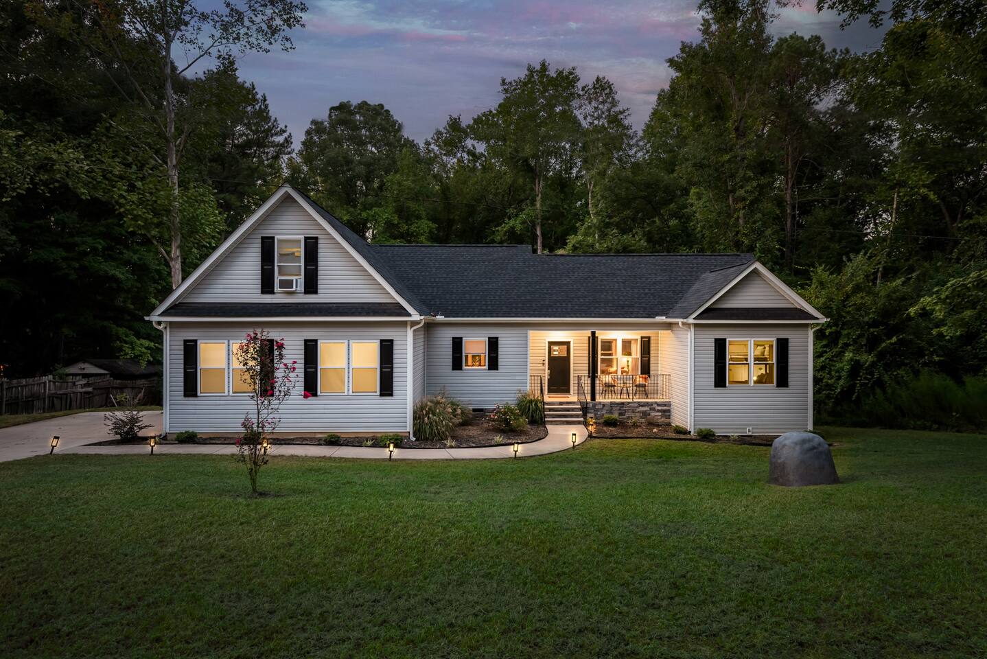 Getting out on the water or hitting the links? This artistic retreat is the perfect oasis. Boasting 4 bedrooms and 7 beds, this brand new home is perfect for your family or large group. Enjoy a larger home on a private .7 acre lot surrounded by nature, while being <15 min from downtown! Each room has a unique yet comfortable design that has been thoughtfully curated by local NC artists. We promise you haven't experienced anything like this before!