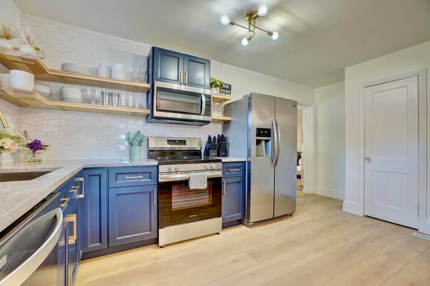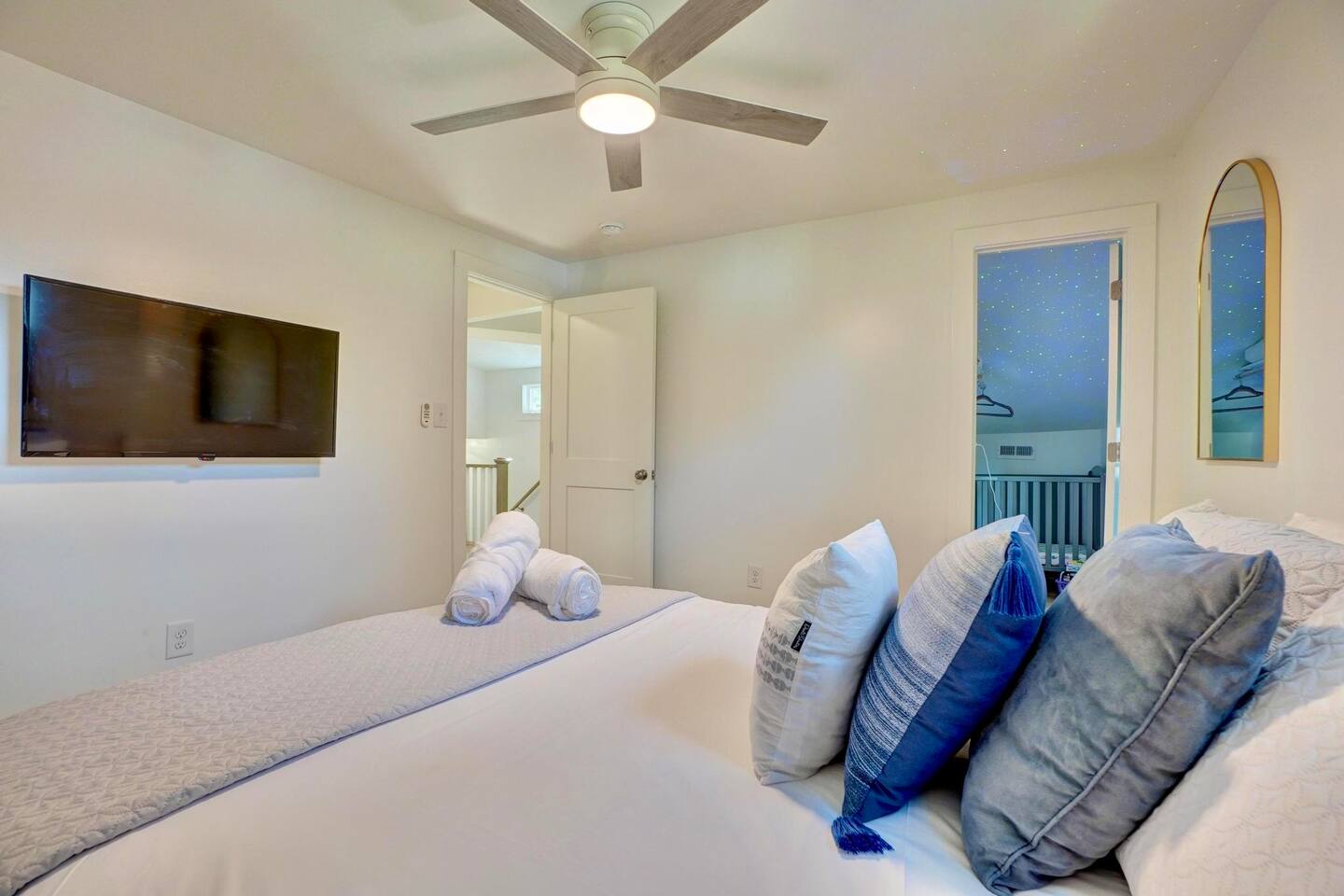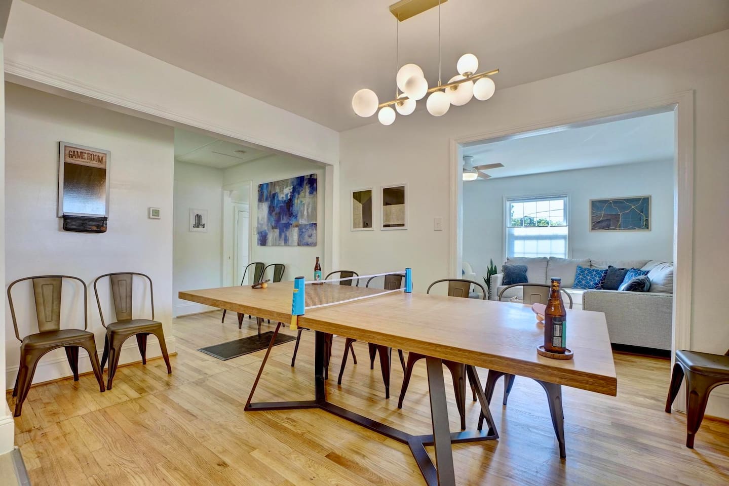 FIRST FLOOR SLEEPING/BATHROOM ARRANGEMENTS: *Bedroom 1: located on the first floor with a King bed *Bedroom 6: located on the first floor with 2 single beds (trundle bed) *Living Room 2: located on the first floor with 2 single beds (trundle bed) *Full bathroom 1: located on the first floor SECOND FLOOR SLEEPING/BATHROOM ARRANGEMENTS: *Bedroom 2: located on the second floor with a king bed *Bedroom 3: located on the second floor with a queen bed, pull out trundle single bed and mini crib *Bedroom 4: located on the second floor with a queen bed *Bedroom 5: located on the second floor with a queen bed *Full bathroom 2: located on the second floor *Full bathroom 3: located on theย secondย floor Like to golf? Guests can schedule an hour at a gold simulator lounge, .5mi from the house, on us!