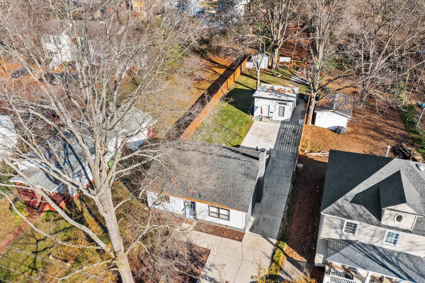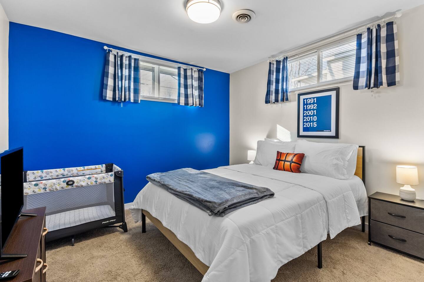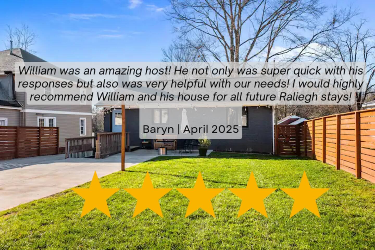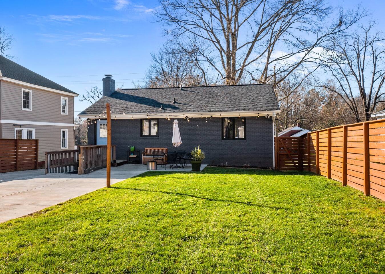 Main House: ☀ Three bedrooms: NC State, Duke, and UNC themed ☀ 1 king bed and 2 queen beds ☀ Sleeper sofa in downstairs living space ☀ Two full bathrooms ☀ Open floorplan ☀ Reclining seat sectional sofa ☀ 75” 4K television with a Yamaha soundbar ☀ Arcade-style basketball shooting game! ☀ Modern, well-equipped kitchen with a huge island ☀ Second living space and kitchenette downstairs with two-burner cooktop. toaster oven, an extra refrigerator and dishwasher ☀ Full-size washer and dryer ☀ Two Pack ‘N Plays and one highchair ☀ Retractable baby gates at the top and bottom of the interior stairs plus another at the top of the exterior stairs ☀ G**gle Fiber Wi-Fi ☀ Off-street parking for up to 4 cars ☀ Patio table/umbrella with gas grill and Solo Stove fire pit ☀ Huge, fenced yard with beautiful oak and pecan trees ☀Electric log set in basement fireplace. Guest House: ☀ Modern, high-ceiling studio built in 2022 ☀ Queen size bed ☀ Full bathroom ☀ 75” 4K TV with a Yamaha soundbar ☀ Well-equipped kitchen with full-size appliances ☀ Pack ‘N Play ☀ Two-person bar table ☀ Outdoor table/chairs 🔹That's a total of four bedrooms, three full bathrooms, three living spaces, three refrigerators, three dishwashers, two washer/dryers, and three Pack ‘N Plays!🔹 Hosted by Will (NCSU '13) and Liz (UNC '12) ***Also, if you are coming to Raleigh to look for a home to buy, your stay could be FREE! Contact us for details!*** Like to golf? Guests can schedule an hour at a gold simulator lounge, .5mi from the house, on us!