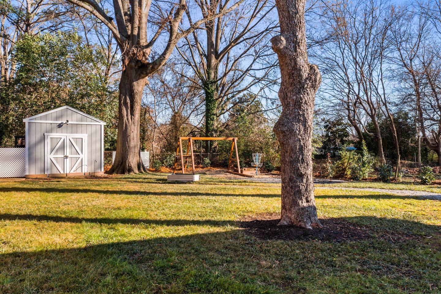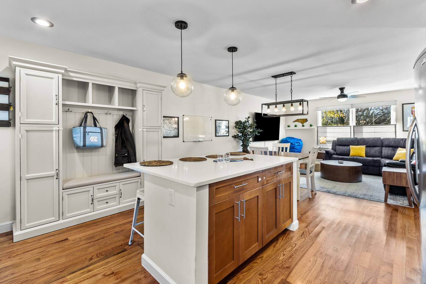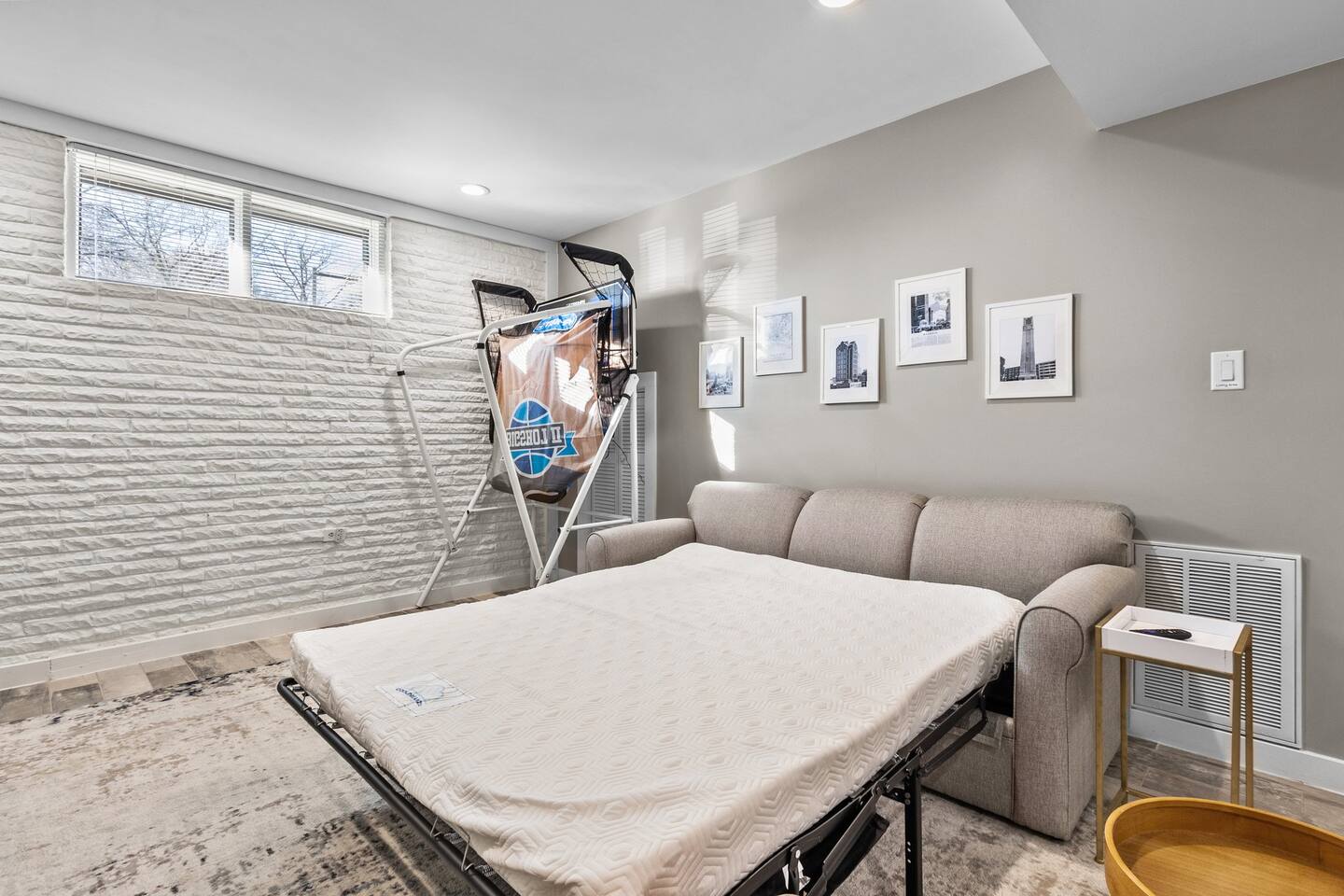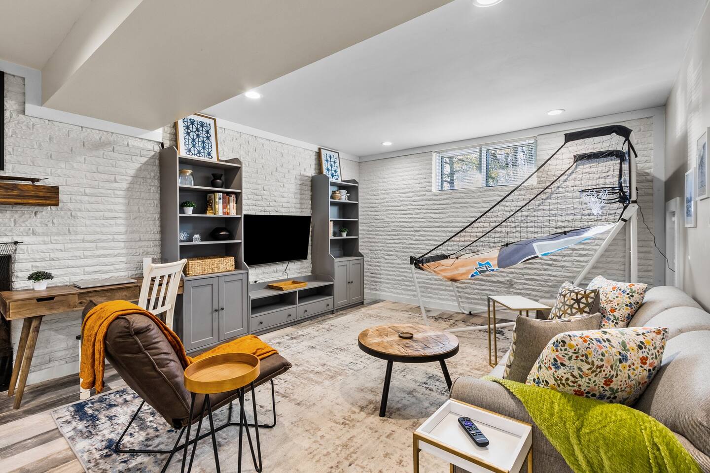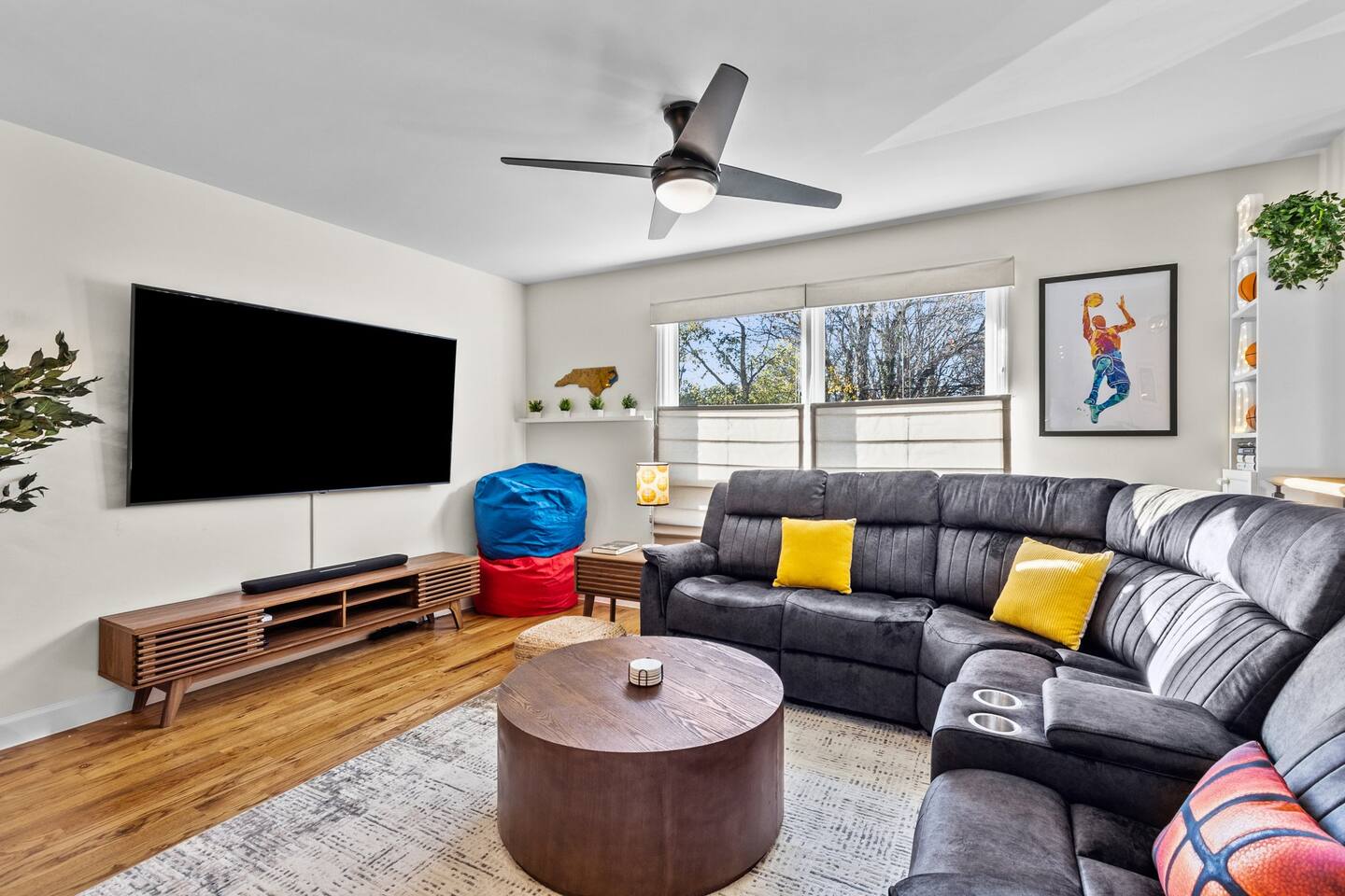Main House: ☀ Three bedrooms: NC State, Duke, and UNC themed ☀ 1 king bed and 2 queen beds ☀ Sleeper sofa in downstairs living space ☀ Two full bathrooms ☀ Open floorplan ☀ Reclining seat sectional sofa ☀ 75” 4K television with a Yamaha soundbar ☀ Arcade-style basketball shooting game! ☀ Modern, well-equipped kitchen with a huge island ☀ Second living space and kitchenette downstairs with two-burner cooktop. toaster oven, an extra refrigerator and dishwasher ☀ Full-size washer and dryer ☀ Two Pack ‘N Plays and one highchair ☀ Retractable baby gates at the top and bottom of the interior stairs plus another at the top of the exterior stairs ☀ G**gle Fiber Wi-Fi ☀ Off-street parking for up to 4 cars ☀ Patio table/umbrella with gas grill and Solo Stove fire pit ☀ Huge, fenced yard with beautiful oak and pecan trees ☀Electric log set in basement fireplace. Guest House: ☀ Modern, high-ceiling studio built in 2022 ☀ Queen size bed ☀ Full bathroom ☀ 75” 4K TV with a Yamaha soundbar ☀ Well-equipped kitchen with full-size appliances ☀ Pack ‘N Play ☀ Two-person bar table ☀ Outdoor table/chairs 🔹That's a total of four bedrooms, three full bathrooms, three living spaces, three refrigerators, three dishwashers, two washer/dryers, and three Pack ‘N Plays!🔹 Hosted by Will (NCSU '13) and Liz (UNC '12) ***Also, if you are coming to Raleigh to look for a home to buy, your stay could be FREE! Contact us for details!*** Like to golf? Guests can schedule an hour at a gold simulator lounge, .5mi from the house, on us!